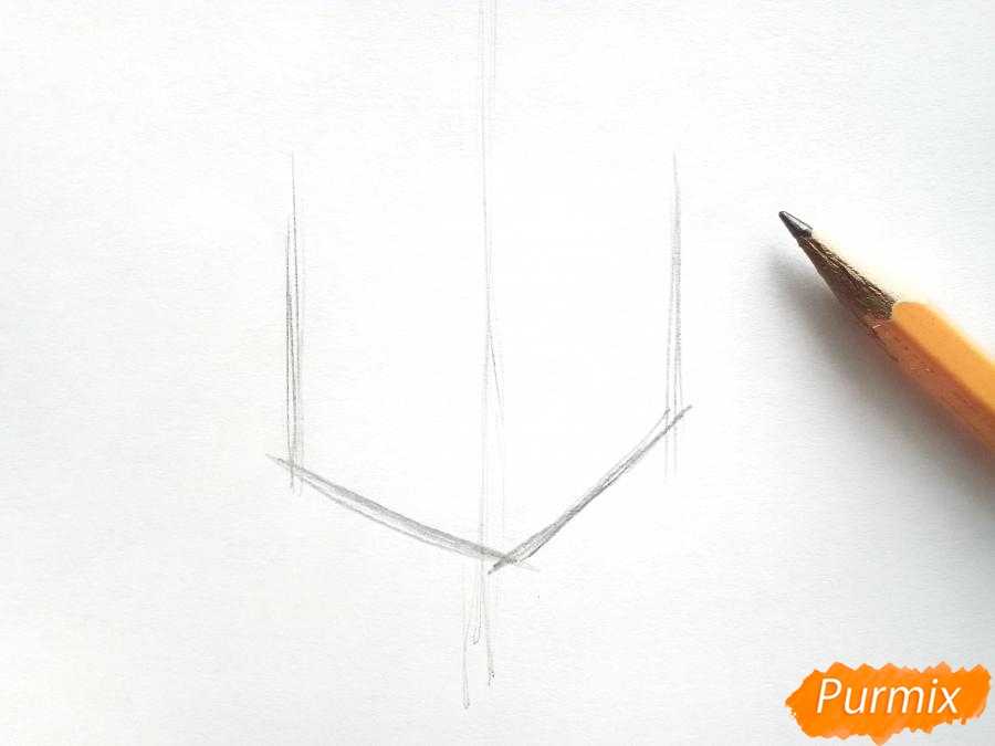 Поделим лист пополам, проведя осевую линию. От неё лево и вправо добавим еще по линии. Они будут расположены под наклоном там, чтобы образовались острые углы. Это будет нижняя часть вазы.