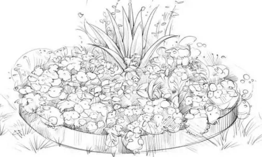Схема “цветок” для создания нарядной клумбы. В зависимости от размера центральная часть может быть занята газонной травой, почвопокровными растениями, слоем гравия или цветных декоративных опилок