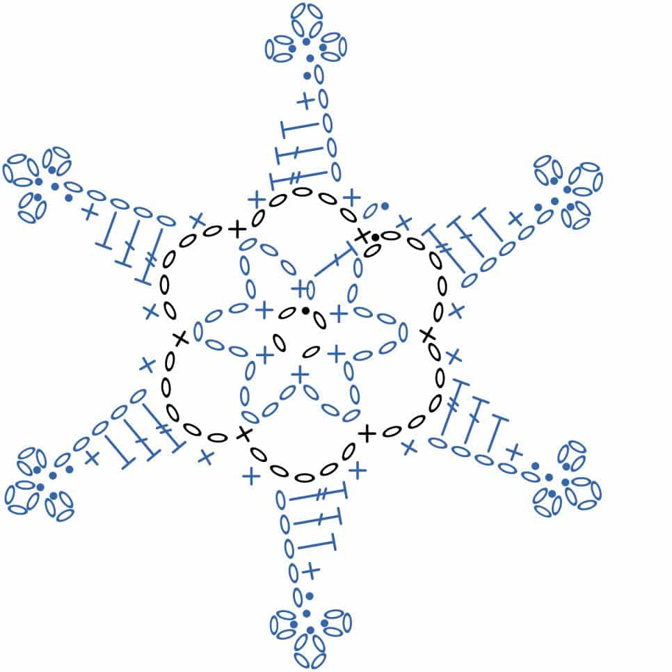 Затем сново провязываем 5 воздушных петель для создания второго ряда снежинки.