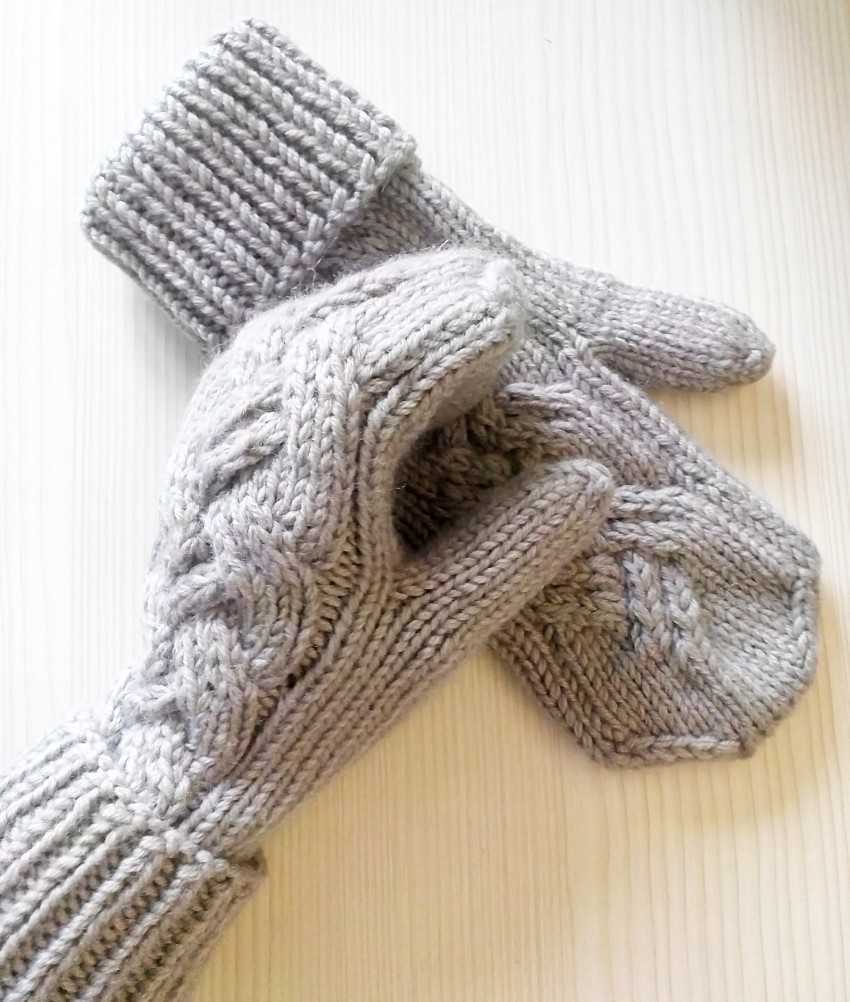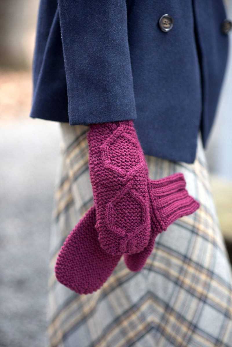 - Узоры кос можно переплетать с дорожками из лицевых петель или вязать между переплетениями различную длину. Все это придаст рукавицам изысканность.