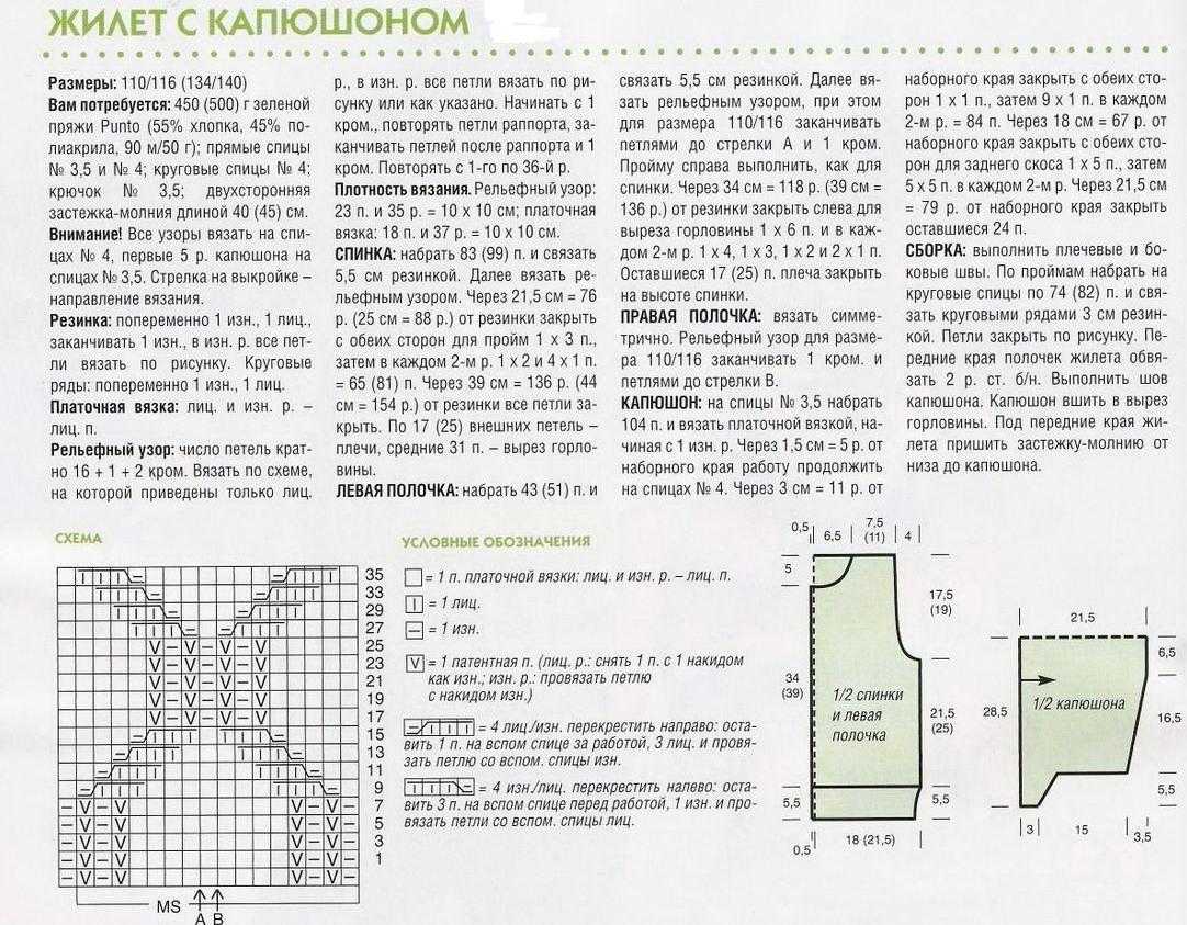В первую очередь, с ребенка необходимо снять мерки. Обхват груди поможет определиться с шириной изделия, а измерение роста — с длиной. Правильная длина безрукавки очень важна. Слишком короткая вещь не будет согревать, а слишком длинная будет неудобна для ношения. Схему и описание безрукавки для девочки (мальчика) спицами нужно положить на видном месте, чтобы при необходимости сверяться с ней. Вот примерное описание работы: