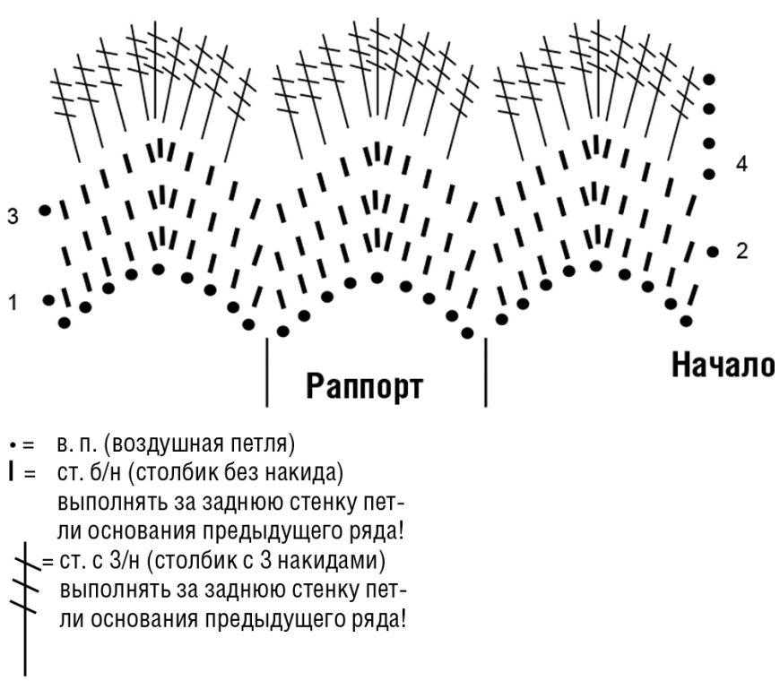 - Продолжите ажурным узором, располагая петли так: 4 п. платочн.в., 7 раппортов по схеме, 4 п. платочн.в.