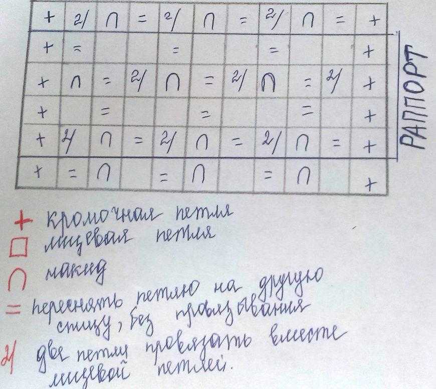 Узоры из мелких ромбиков мохера получаются очень красивыми и модными. Число петель в рапорте должно делиться на шесть без остатка, еще 1 звено и 2 кромочные. Начинаем работу с кромочной петельки. Согласно схемы делается только лицо орнамента, выворот – по рисунку.