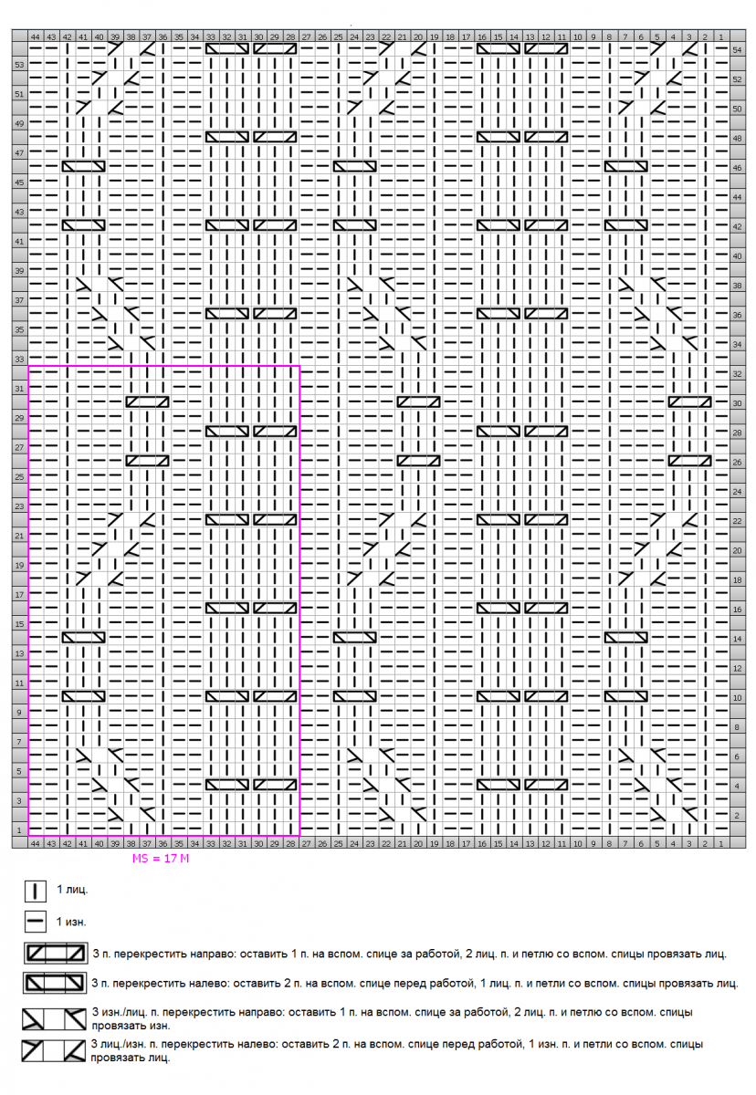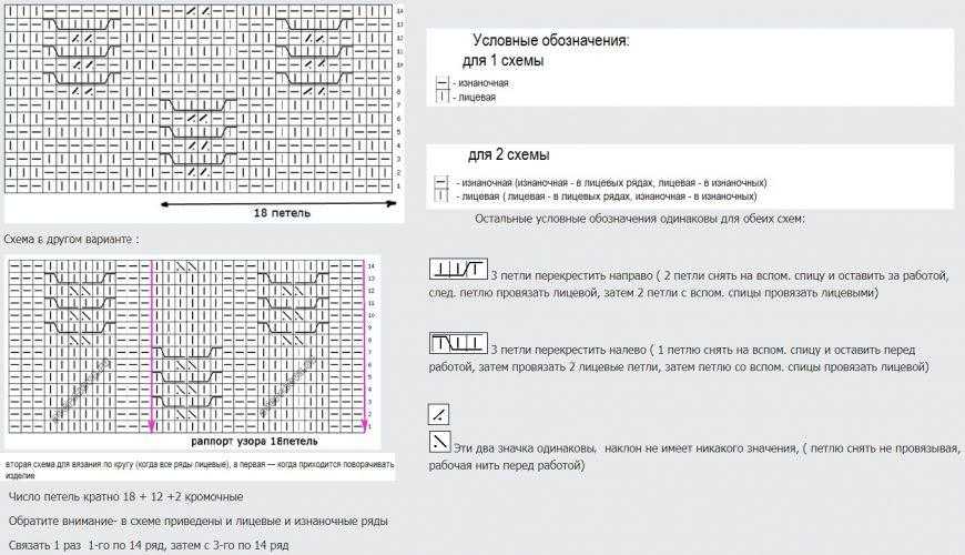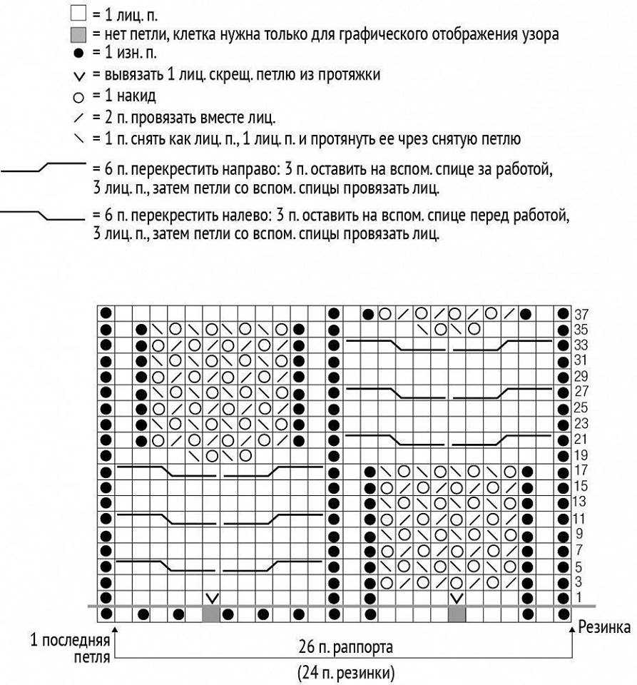 Резинку вяжите поочередно: 2 лицевые и 2 изнаночные петли. Главный рисунок делайте по схеме: