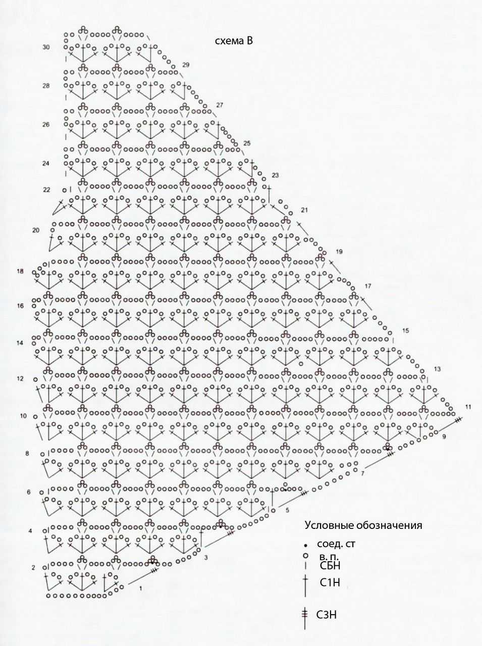 Правая часть болеро: вяжем цепочку в 13 воздушных петелек и начинаем ажурный узор, как в схеме В – с первого по тридцатый ряд. Нить обрезать.