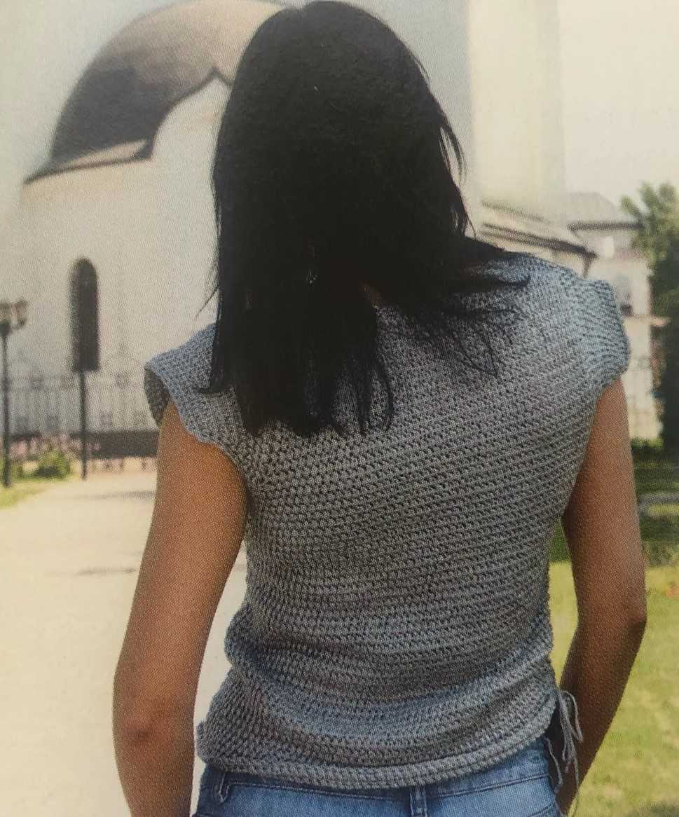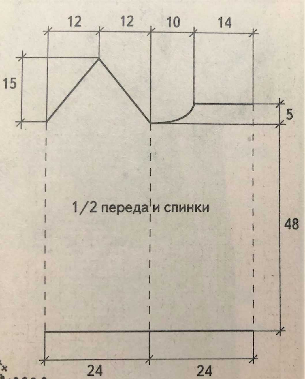 Для оформления линии пройм в 38-м р. закрыть с обеих сторон 2 раза по 2 п., 3 раза по 1 п. В работе находится 50 п. Далее вязать 9 р. основным узором «тунисская вязка». Для оформления линии горловины в 10-м р. от линии пройм оставить непровязанными центральные 3 п. и с обеих сторон от них 1 раз по 3 п., 3 раза по 2 п., 7 раз по 1 п. В работе находится 15 п. В 62-м р. от начала вязания все петли закрыть в одном ряду. Левое плечо выполнить аналогично.