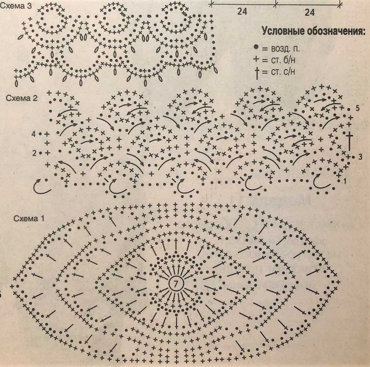 Чтобы не всматриваться в фотографию или готовое изделие, а точно знать, как получить такую вещь, к каждой схеме прилагаются инструкции со знаковыми значениями, как на фото ниже. Любое вязание начинается с набирания цепочки из воздушных петель, а далее чаще идут столбики без накида. В зависимости от сложности, рисунки выполняются повторно или чередуются с другими узорами. Расшифровка стандартных обозначений: