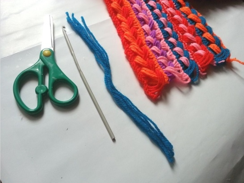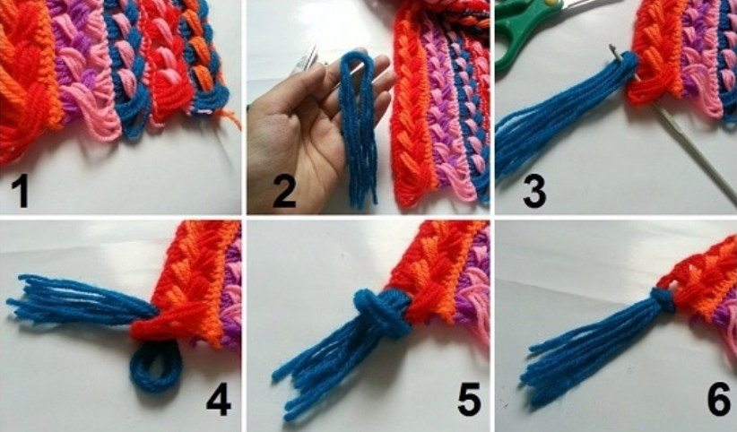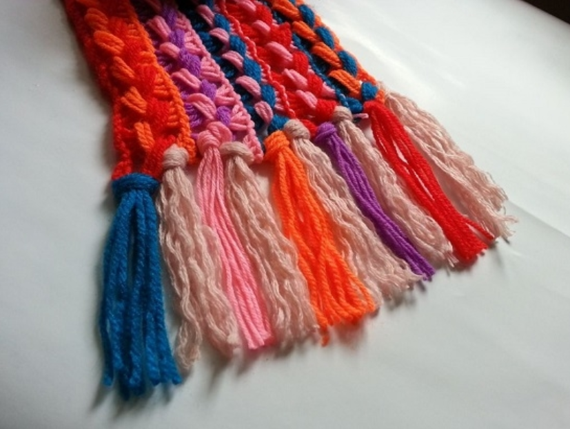 Чтобы оригинальный шарфик понравился ребенку, следует использовать контрастные оттенки нити. Края по желанию можно украсить цветными кисточками.