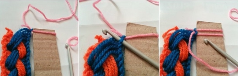 - Вязать 7-9 сантиметров 1 косу столбиками с накидом, 1 ряд столбиками без накида.