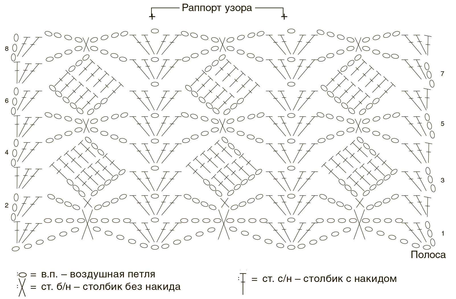 - Затем 3 ВПП, в арку пышный столбик (ПС), 2 ВП, ПС, 2 ВП, ПС, над провязанным столбиком ВП — повторять до конца.